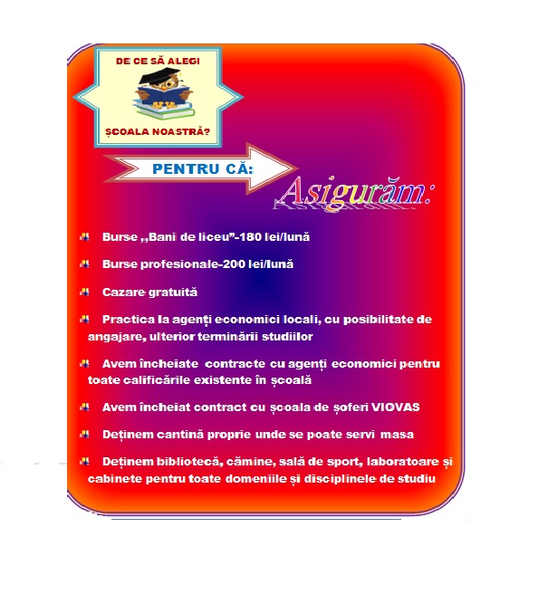 Noua institutie ofera viitorilor absolventi posibilitatea pregatirii intr-o paleta larga de meserii (profesii) atat din domenioul transporturilor cat si din cel al constructiilor.
